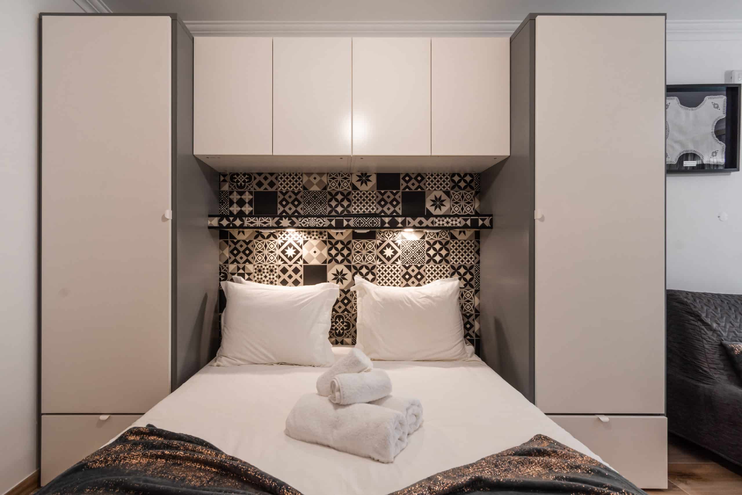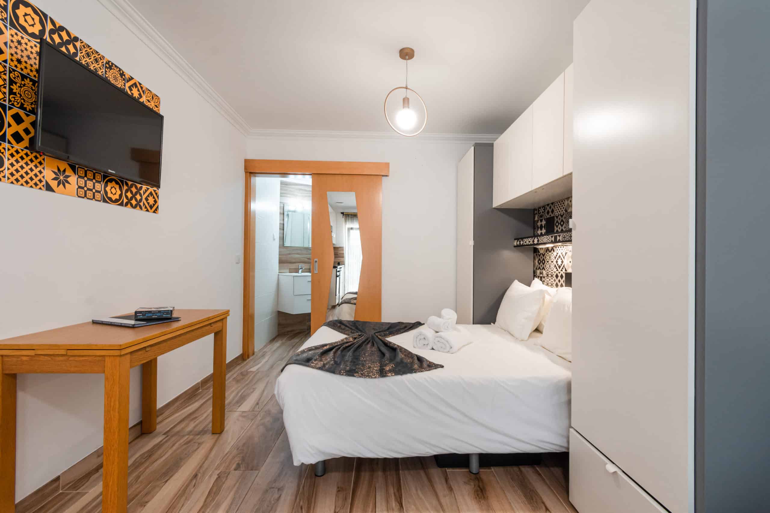 Com cama de casal e poltrona-cama para 1 pessoa, mesa extensível com 3 cadeiras e roupeiros com varão e prateleiras.