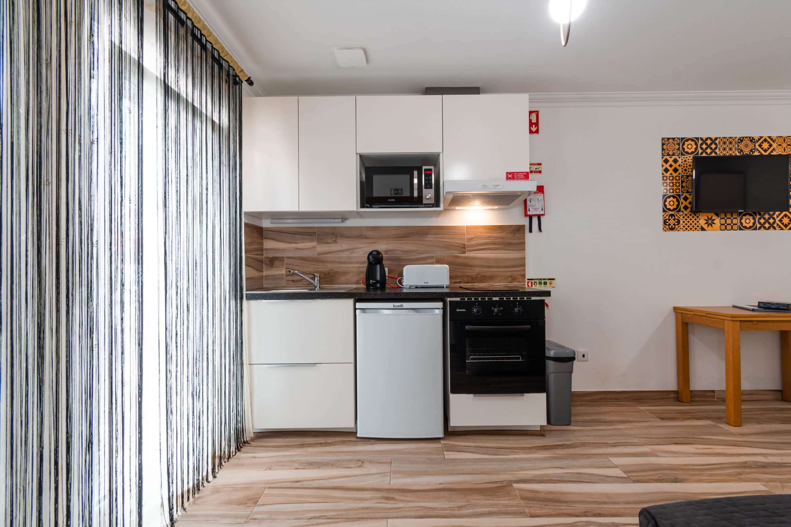 Têxteis de quarto e banho incluídos, bem como, loiças, produtos e acessórios de limpeza, torradeira, máquina de café de cápsulas Dolce Gusto (cápsulas não fornecidas), varinha mágica, microondas, placa vitro cerâmica com 2 pontos de indução, forno eléctrico, frigorífico com pequeno congelador, TV LED com entradas HDMI e USB, tábua e ferro de engomar e secador de cabelo.