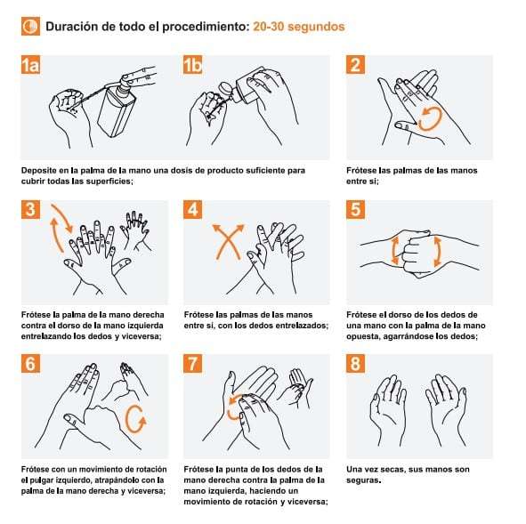 - Higiene de manos: lávese las manos con frecuencia con agua y jabón durante al menos 20 segundos o use un desinfectante para manos que tenga al menos 70 ° de alcohol, cubra todas las superficies de sus manos y frótelas hasta que estén secas.