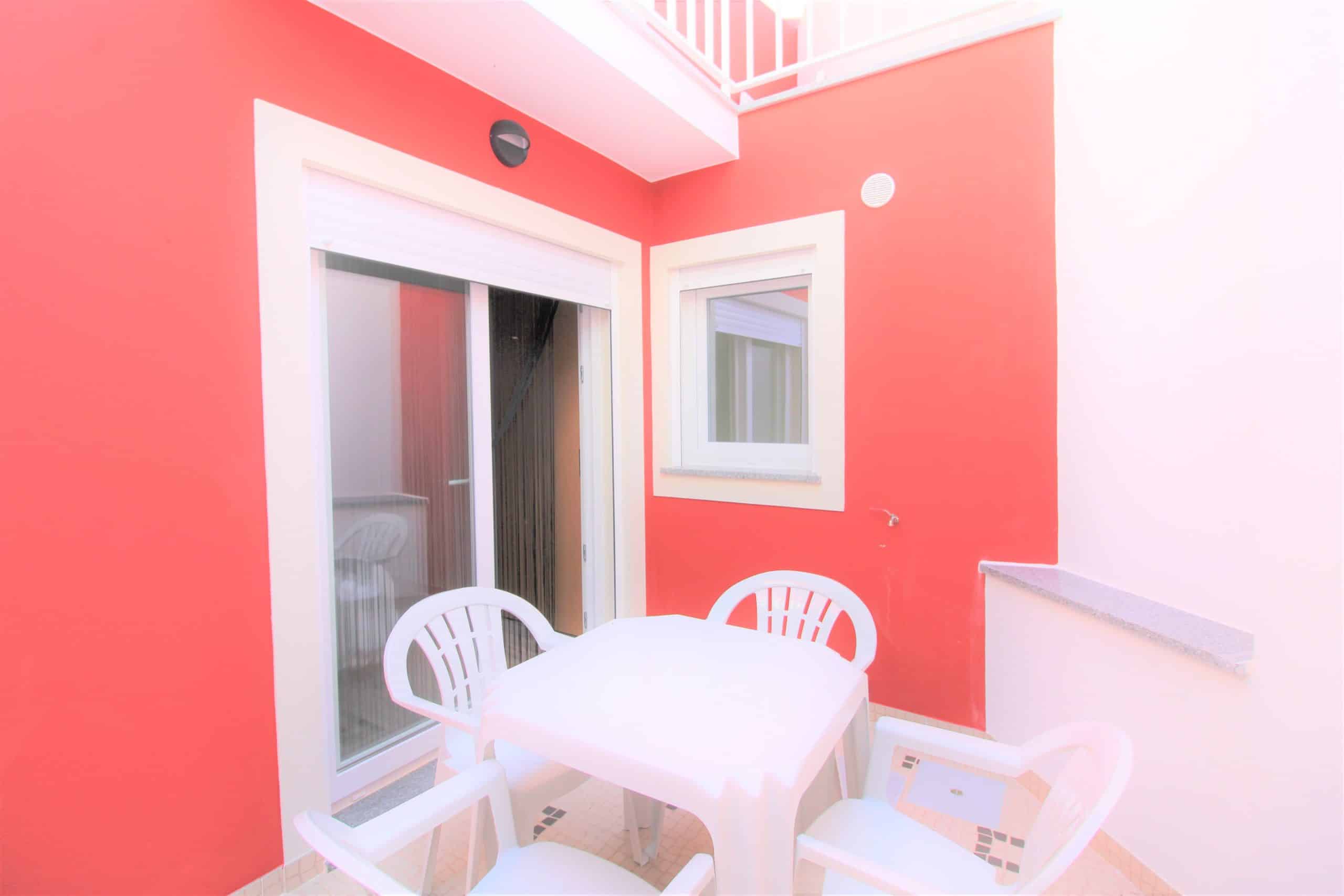 Patio avec barbecue, table avec 4 chaises et chapeau de soleil.