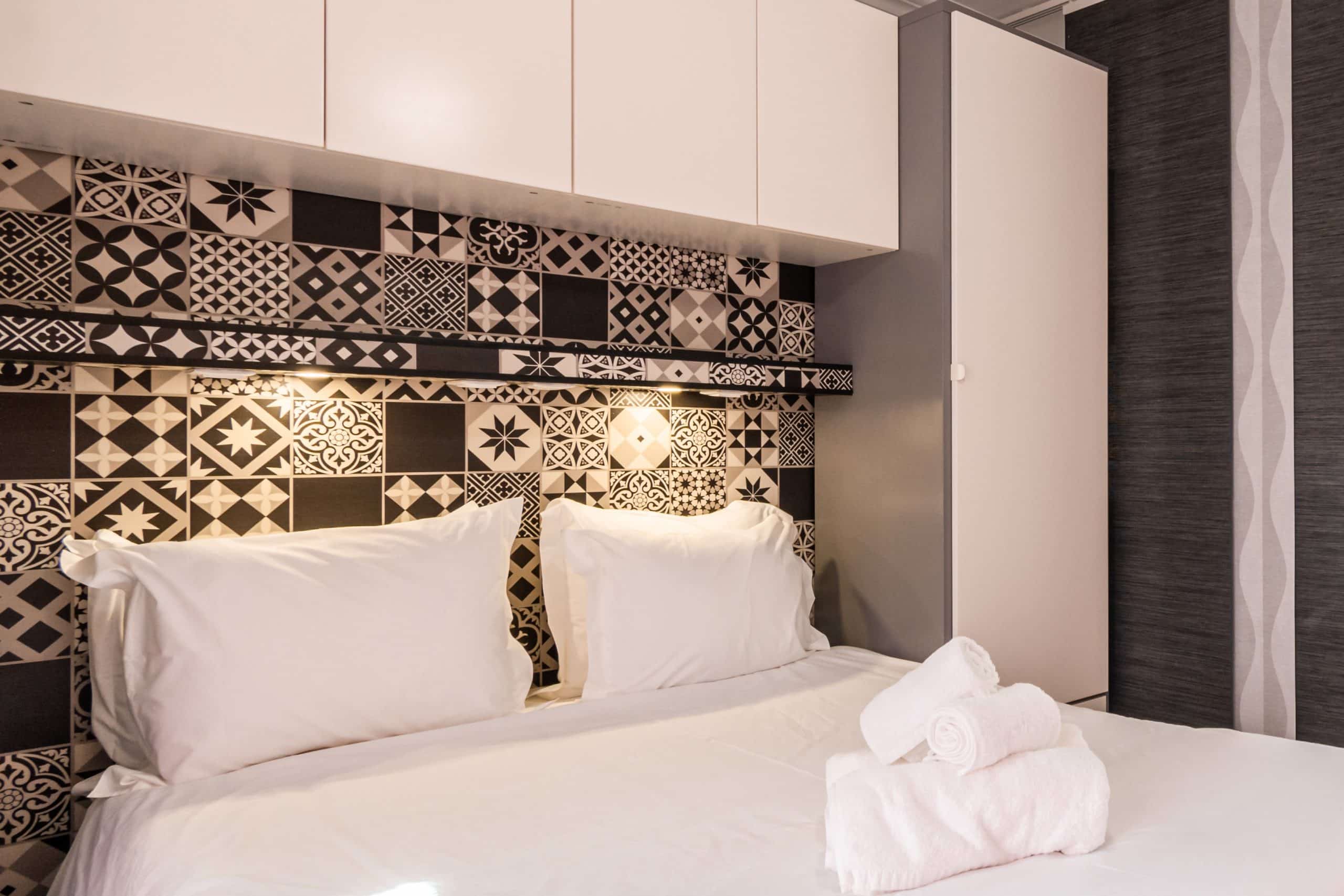 Avec lit double et canapé-lit pour 2 personnes, table extensible avec 2 chaises et 2 bancs, armoire avec tringles et étagères.
