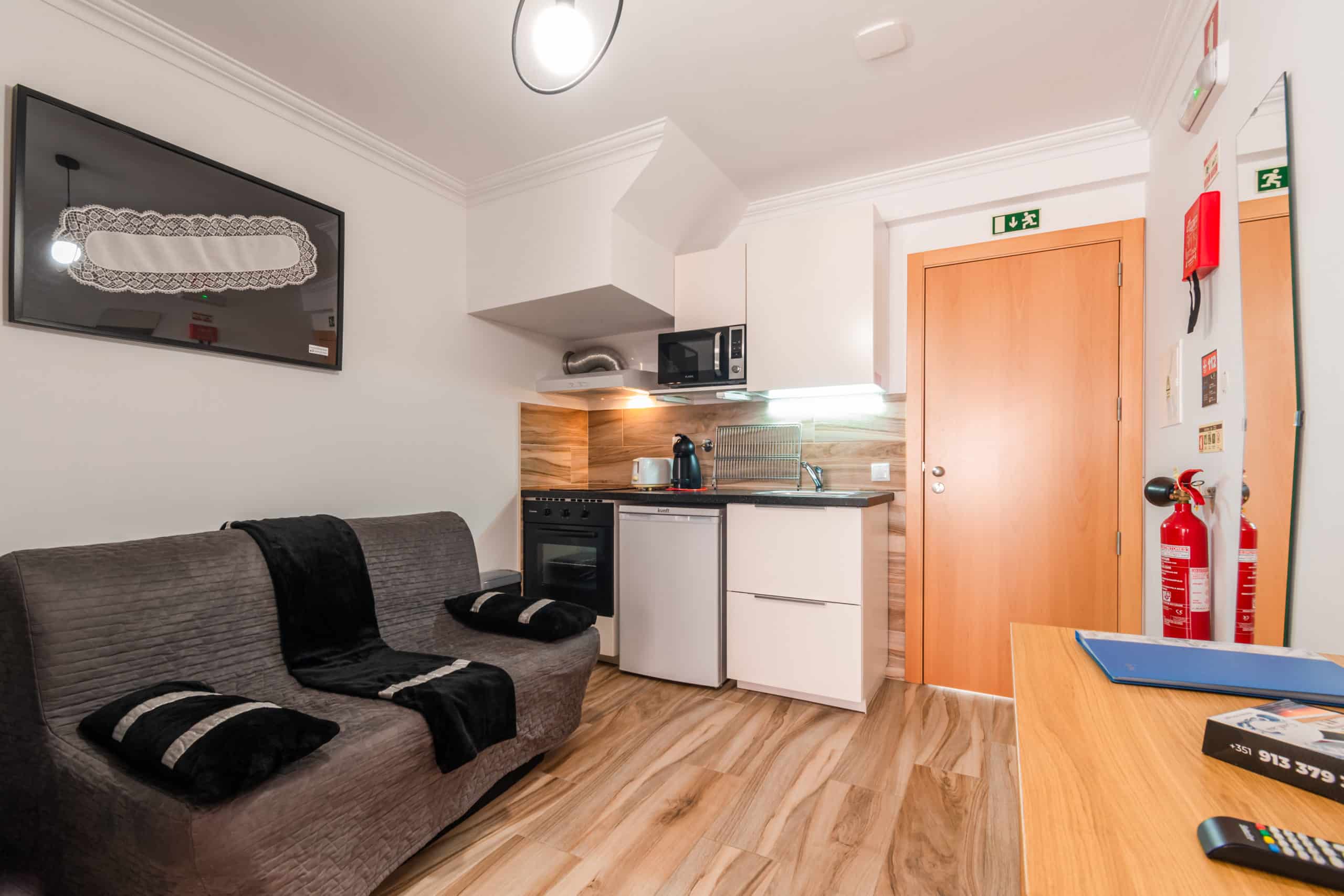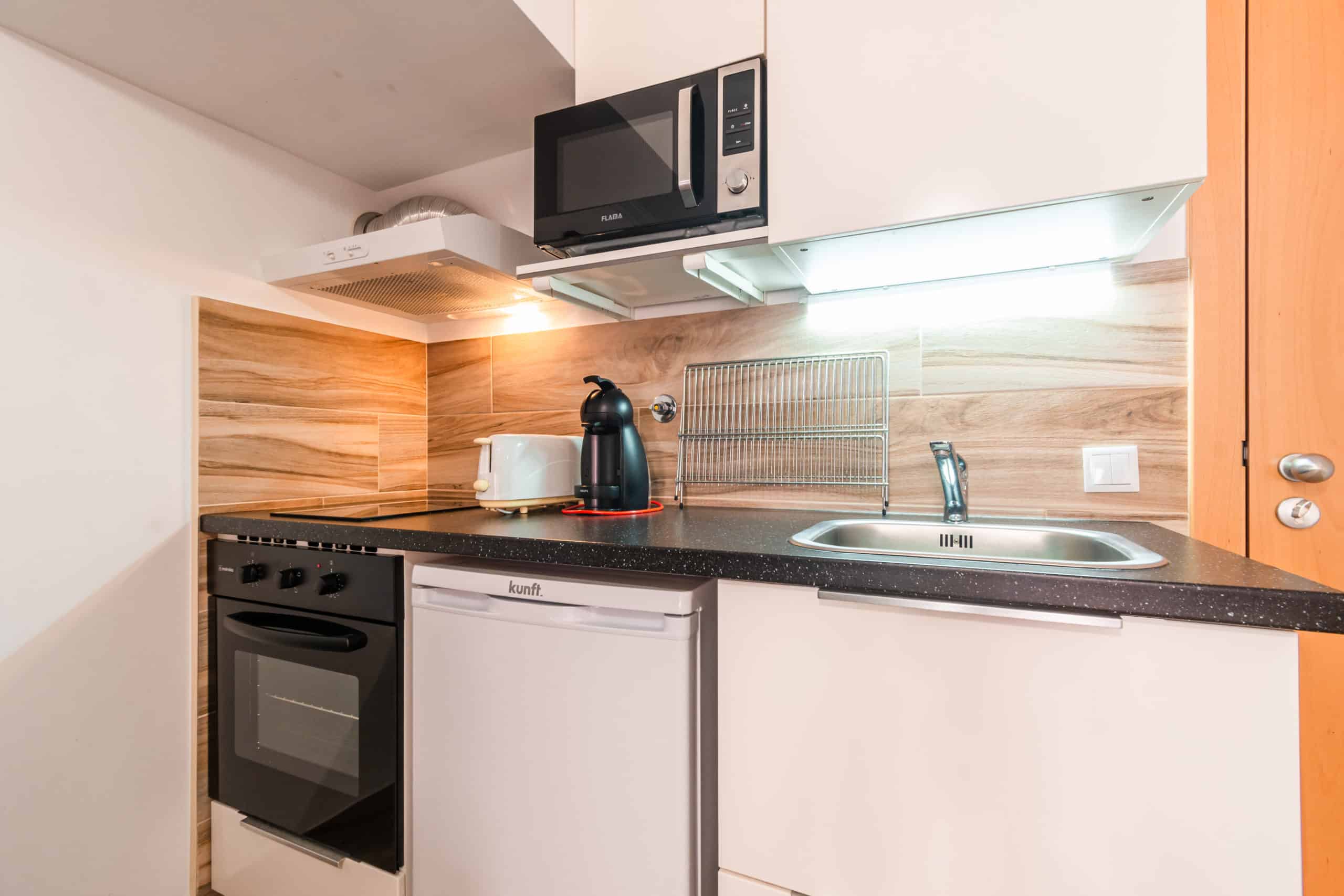 Avec linge de lit et de cuisine inclus, vaisselle, produits d'entretien et accessoires, grille-pain, machine à café capsule Dolce Gusto (capsules non fournies), mixeur plongeant, micro-ondes, 2 plaques vitrocéramiques à induction, four électrique, réfrigérateur avec congélateur, TV LED avec Entrées HDMI et USB, ventilateur du plafond et sèche-cheveux.